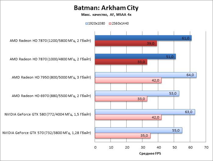| Batman: Arkham City. Встроенный бенчмарк | DirectX 11 | Макс. качество | AF, MSAA 4x | 1920х1080 / 2560х1440 |