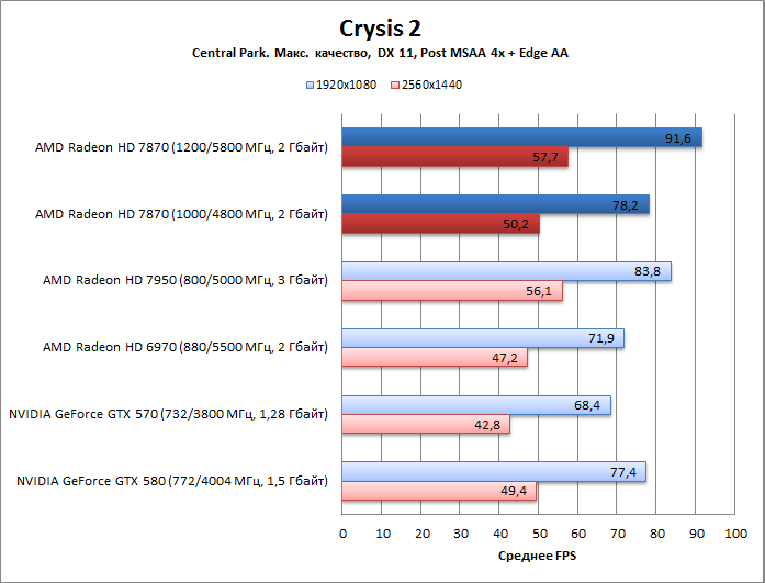| Crysis 2 + Adrenaline Crysis 2 Benchmark Tool | DirectX 11 | Central Park. Макс. качество, DirectX 11, текстуры высокого разрешения | AF 16x, Post MSAA + Edge AA | 1920х1080 / 2560х1440 |