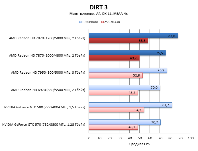 | DiRT 3 + Adrenaline Racing Benchmark Tool | DirectX 11 | Aspen, 8 машин. Макс. качество, DirectX 11 | AF, AA 4х | 1920х1080 / 2560х1440 |