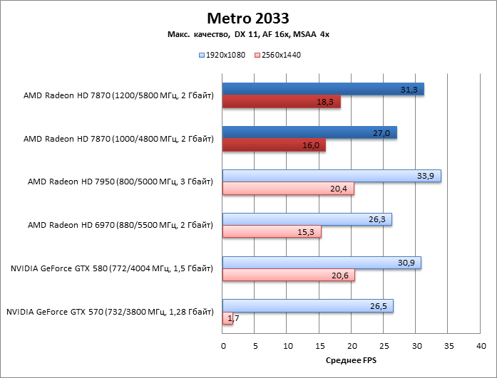 | Metro 2033 + Metro 2033 Benchmark | DirectX 11 | Макс. настройки, DirectX 11, DOF, тесселяция, NVIDIA PhysX выкл. | AF 16x, MSAA 4x | 1920х1080 / 2560х1440 |