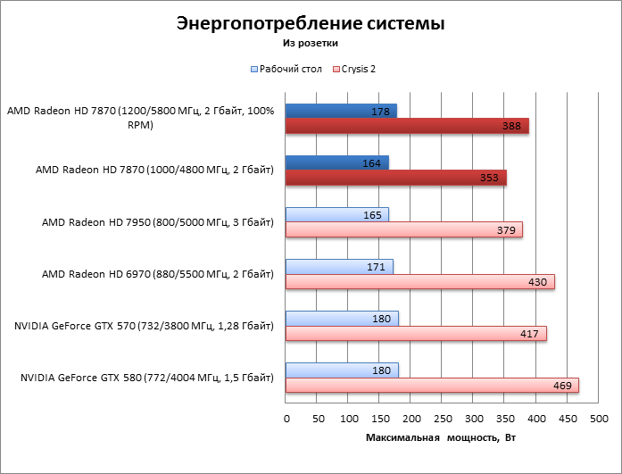 Энергопотребление системы с HD 7870 на 26 Вт меньше, чем в случае с HD 7950, но система с разогнанной картой уже потребляет больше. Разрыв между HD 7870 и GeForce GTX 570 огромен, не говоря уже о GTX 580 — последний вообще чрезвычайно прожорлив.