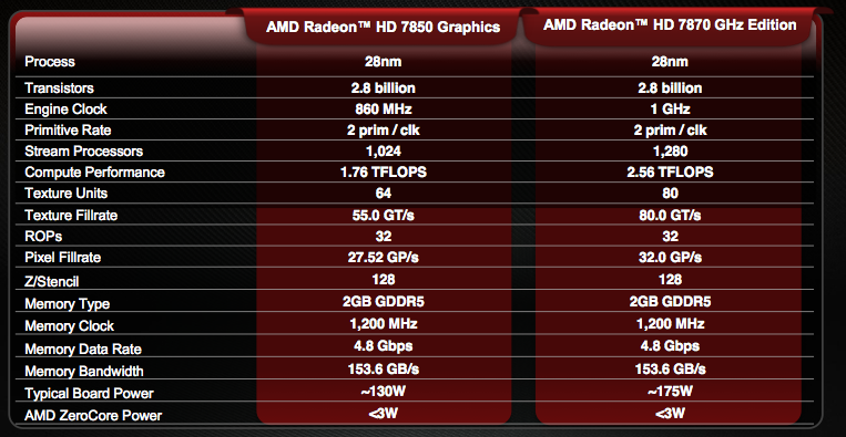 В ядре Pitcairn 2,8 млрд транзисторов (в Tahiti — 4,31 млрд), производится он по техпроцессу 28 нм. А если транзисторов меньше, то частота больше: 1 ГГц. Видеопамять — 2 Гбайт, работает на эффективной частоте 4,8 ГГц. Максимальное энергопотребление Radeon HD 7870 ниже, чем у HD 6950 (175 и 200 Вт соответственно) и чуть выше, чем у GeForce GTX 560 Ti (170 Вт). Как и прочие карты 7000-й серии, HD 7870 умеет уходить в режим ZeroCore, когда мощность падает ниже 3 Вт, и полностью останавливается турбинка кулера.