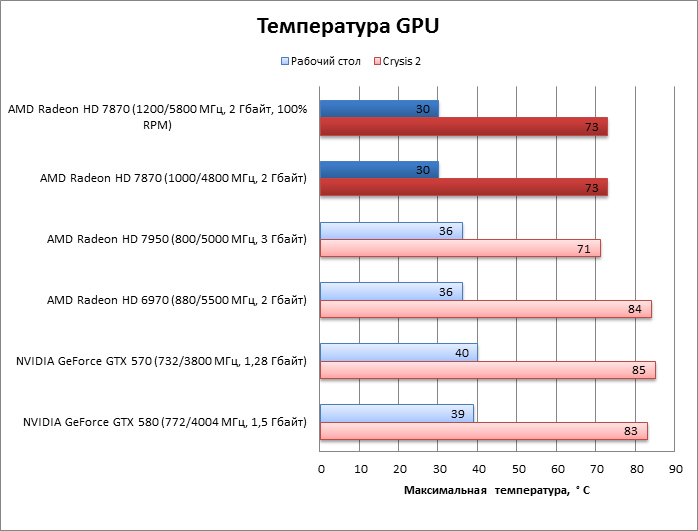Несмотря на то, что у Radeon HD 7870 TDP существенно меньше, чем у HD 7950, процессор под нагрузкой нагревается сильнее. Разгон не прибавил температуры, но это лишь потому, что кулер работал на полной скорости. Оба главных конкурента, GeForce GTX 570 и GTX 580, гораздо горячее.