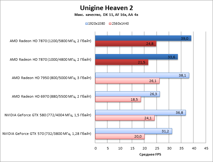 | Unigine Heaven 2 | DirectX 11 | Макс. качество, DirectX 11, тесселяция в режиме Extreme | AF 16x, MSAA 4x | 1920х1080 / 2560х1440 |