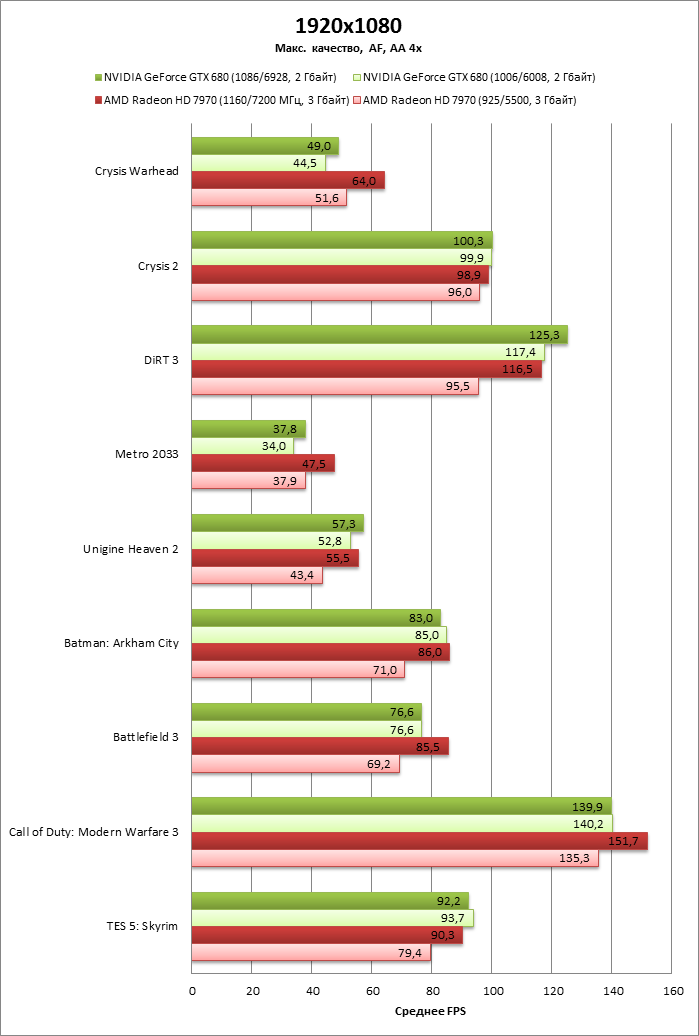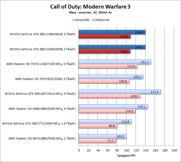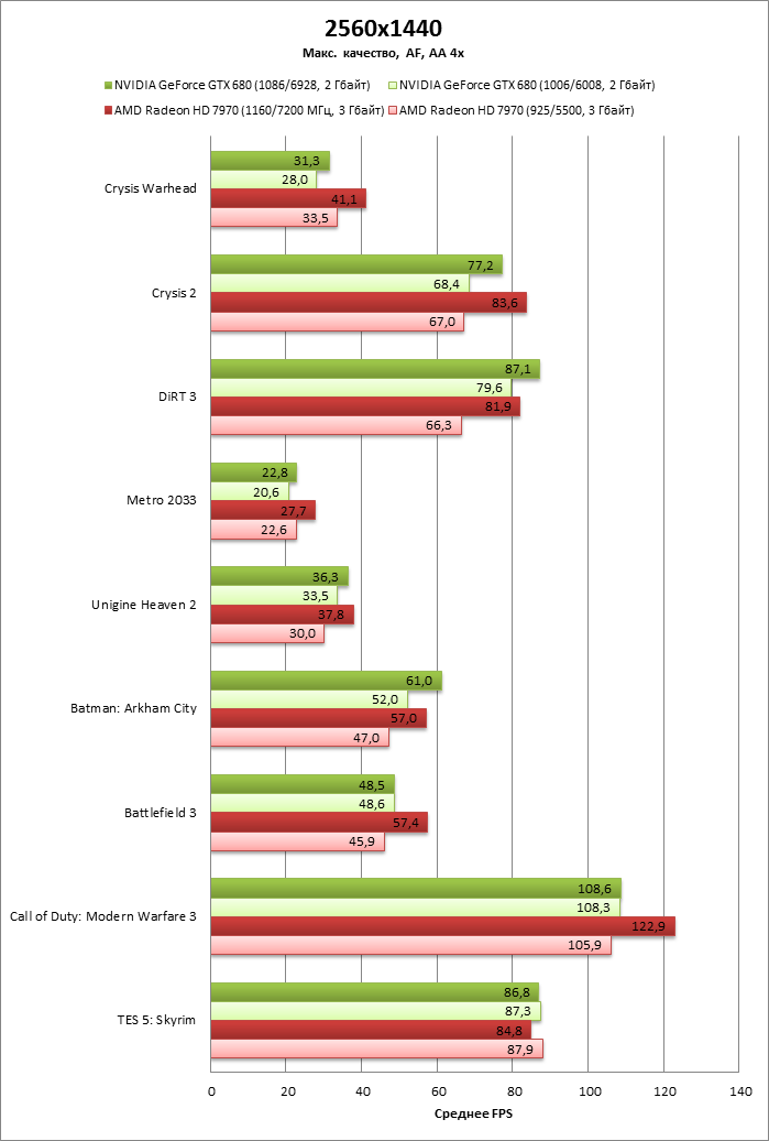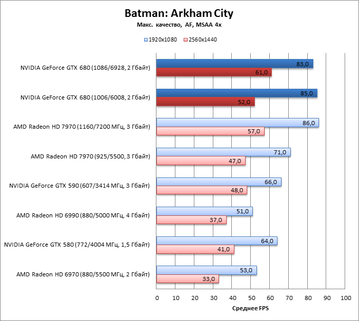 | Batman: Arkham City. Встроенный бенчмарк | DirectX 11 | Макс. качество | AF, MSAA 4x | 1920х1080 / 2560х1440 |