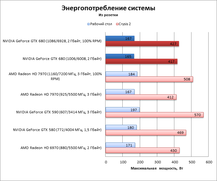 Пиковое энергопотребление системы с GTX 680 на борту немного выше, чем у HD 7970, и приближается к оному у HD 6970. По сравнению с GTX 580 прогресс налицо, но разница не критическая. В разгоне GTX 680 развивает мощность лишь на 10 Вт больше, чем в штатном режиме. Что и не удивительно, так как разгон невелик.