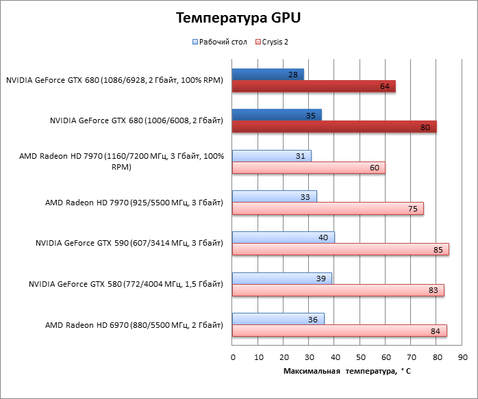 По температурному режиму GTX 680 ничем не лучше своих соперников. Radeon HD 7970 под нагрузкой греется меньше, GTX 580 — немного сильнее. Все дело в новой системе охлаждения, малошумной, но не столь эффективной