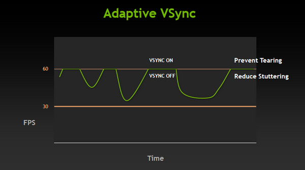 А почему вертикальную синхронизацию так редко используют? Потому что если FPS меньше частоты развертки, VSync приводит его к половине или четверти частоты, например 30 и 15 FPS. Возникают тормоза. Чтобы устранить этот недостаток, NVIDIA предложила простое решение: если FPS больше частоты развертки, то VSync работает, а когда падает меньше, VSync отключается. Эта функция совместима и с картами GeForce предыдущего поколения.