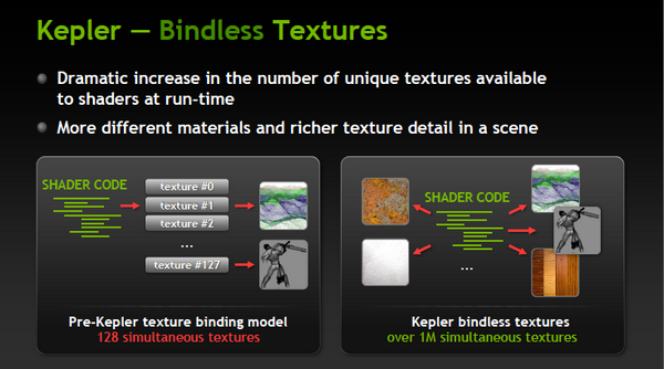 А вот еще одна функция, эксклюзивная для Kepler. В Fermi шейдерная программа могла обращаться только к 128 текстурам, указанным в специальной таблице. Теперь текстуры в памяти доступны шейдеру напрямую, более миллиона текстур одновременно. Потенциально эта функция увеличивает богатство игровых сцен, но API DirectX 11 все равно ограничивает шейдер 128 текстурами, поэтому Bindless Textures пока можно использовать только в OpenGL или непосредственно с помощью NVAPI.
