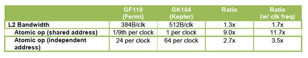 Как и у GF100/110, в каждом потоковом мультипроцессоре GK104 есть кеш L1 объемом 64 Кбайт. А вот общий кеш L2 уменьшился: с 768 до 512 Кбайт. Однако пропускная способность кеша увеличилась на 73%. Выросла скорость атомарных операций (чтение + запись).