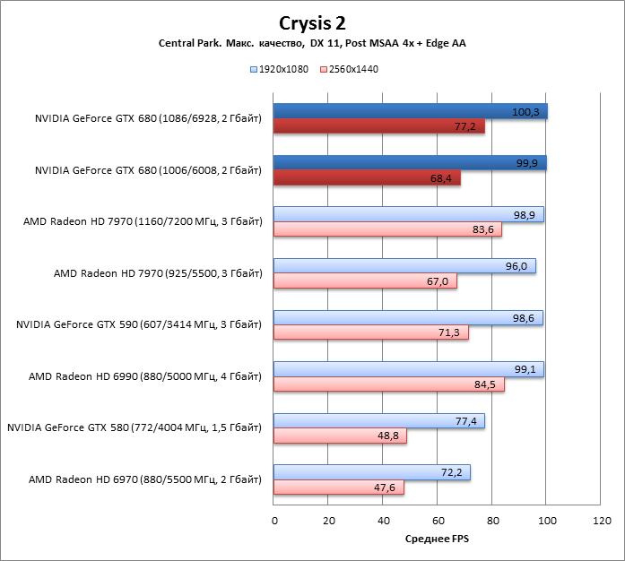 | Crysis 2 + Adrenaline Crysis 2 Benchmark Tool | DirectX 11 | Central Park. Макс. качество, DirectX 11, текстуры высокого разрешения | AF 16x, Post MSAA + Edge AA | 1920х1080 / 2560х1440 |