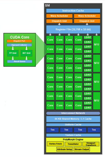 Внутри SM ядра CUDA используются совместно с другими вычислительными компонентами: блоками Load/Store (LD/ST), текстурными блоками, блоками интерполяции (нет на диаграмме NVIDIA), блоками вычисления специальных функций (Special Function Units, SFU) — тригонометрических, например. Все эти компоненты получают инструкции для выполнения от одних и тех же диспетчеров.