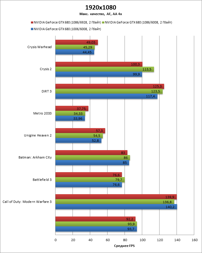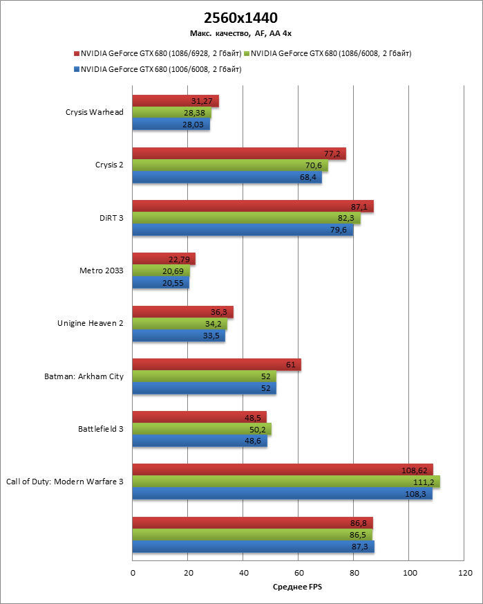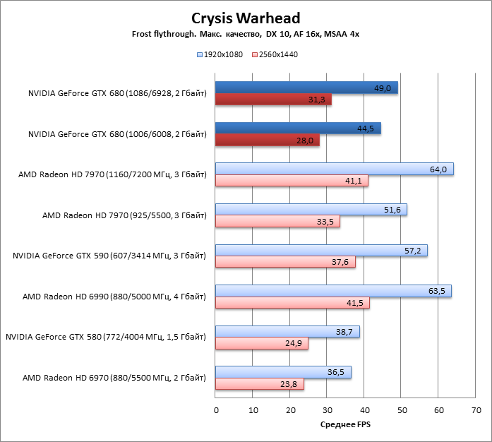 | Crysis Warhead + Framebuffer Crysis Warhead Benchmarking Tool | DirectX 10 | Frost flythrough. Макс. настройки, DirectX 10 | AF 16x, MSAA 4x | 1920х1080 / 2560х1440 |