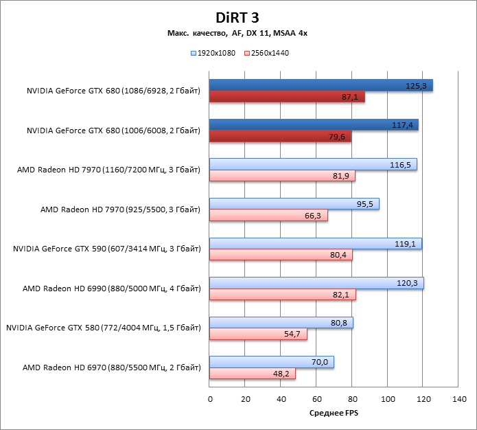 | DiRT 3 + Adrenaline Racing Benchmark Tool | DirectX 11 | Aspen, 8 машин. Макс. качество, DirectX 11 | AF, AA 4х | 1920х1080 / 2560х1440 |
