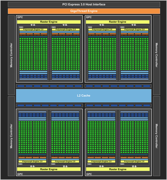 Как и процессоры Fermi, Kepler имеет легко масштабируемый модульный дизайн. Все вычислительные компоненты распределены между четырьмя «графическими кластерами» (Graphics Processing Cluster, GPC). Вне кластеров находится только общий кеш L2, контроллеры памяти, ROP (на схеме — голубые блоки рядом с кешем) и блок GigaThread Engine, распределяющий нагрузку между GPC.