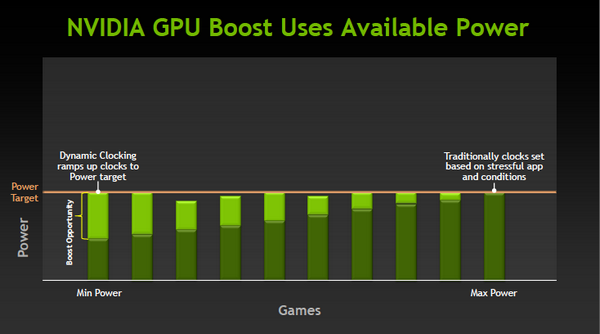 Эта функция — аналог PowerTune в последних видеокартах Radeon. Фактически она представляет собой динамический разгон GPU в те моменты, когда это позволяет энергопотребление. NVIDIA показывает, что в большинстве игр карта не добирает мощности до заявленного TDP (195 Вт), а потому частоту процессора можно существенно увеличить.