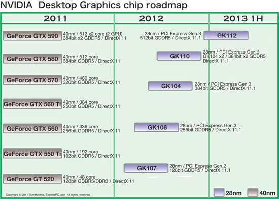 Для начала вот этот нашумевший слайд. Судя по тому, что здесь написано, в начале 2012 года мы должны были увидеть бюджетный GPU GK107 со 128-битной шиной памяти и PCI-E 2.0, затем более мощный чип GK106 (шина памяти 256 бит, PCI-E 3.0) и GK104, похожий на GF110 своей 384-битной шиной. Ну а в конце 2012 — начале 2013 года нас якобы ждет двухпроцессорная карта на базе GK104 и однопроцессорный монстр GK112 с 512-битной шиной памяти.