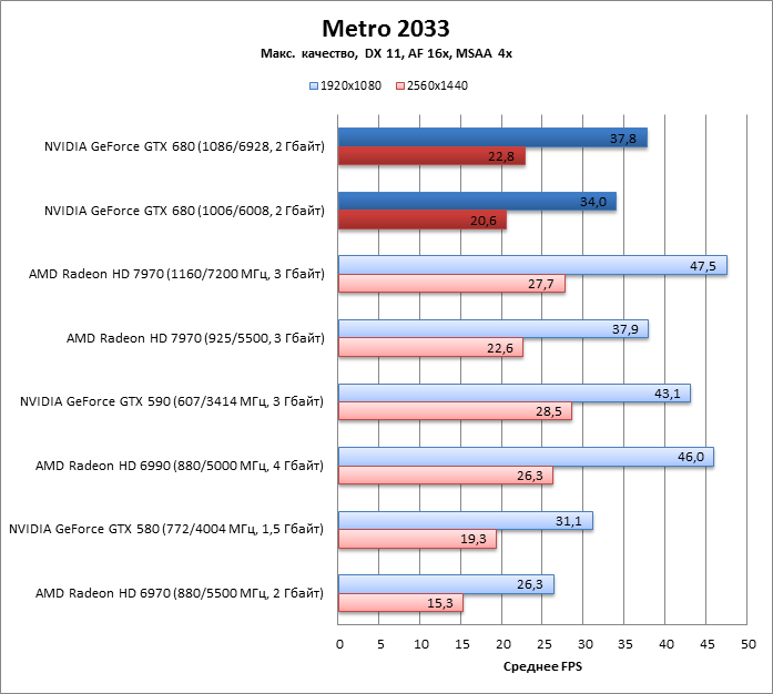 | Metro 2033 + Metro 2033 Benchmark | DirectX 11 | Макс. настройки, DirectX 11, DOF, тесселяция, NVIDIA PhysX выкл. | AF 16x, MSAA 4x | 1920х1080 / 2560х1440 |