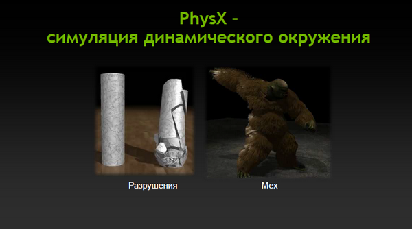 В API высокого уровня APEX (а значит — для всех видеокарт с PhysX) скоро войдут функции динамического разрушения объектов и отображения меха. Особенно интересно первое. Сейчас разрушение игровых объектов определяется заранее, но, благодаря новой функции, GPU будет создавать осколки автоматически, каждый раз по-новому.