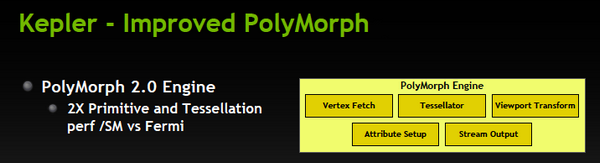В архитектуре Fermi нет отдельного геометрического блока, как в Graphics Core Next от AMD. Вместо этого в каждом потоковом мультипроцессоре есть собственный PolyMorph Engine, и они соединены специальным интерфейсом. Именно благодаря геометрической мощи адаптеры GeForce доминировали в задачах с тесселяцией вплоть до выхода карт Radeon серии HD 7000, которые серьезно проапгрейдили по этой части. В GK104, обратите внимание, блоков PolyMorph Engine стало меньше по сравнению с GF110, так как меньше потоковых мультипроцессоров. Но NVIDIA уверяет: PolyMorph Engine версии 2.0 стал почти вдвое более эффективным, что с лихвой компенсирует сокращение.