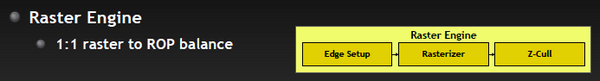 Raster Engine представляет собой конвейер из трех стадий, на которых происходит вычисление граней геометрических примитивов, проекция пикселей на поверхности и отсечение невидимых пикселей соответственно. Подробно о каких-либо изменениях в Raster Engine NVIDIA не сообщает, но, судя по официальному слайду, теперь их производительность один к одному согласуется с пропускной способностью ROP. Ну да, если каждый Raster Engine за такт обрабатывает 8 пикселов, как в Fermi, то четыре «движка» обрабатывают 32 пиксела, что соответствует 32 ROP.