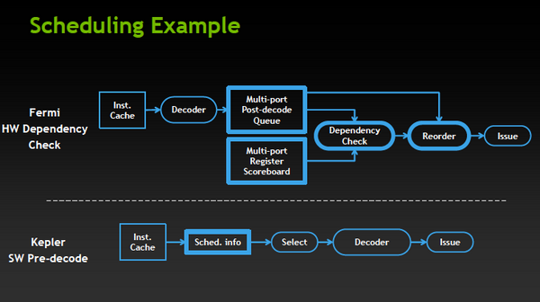 В-третьих, логика планировщика подверглась упрощению. В Fermi планировщик определял зависимости операций в шейдерном коде и переупорядочивал выполнение различных warp. Теперь задача разрешения зависимостей возложена на компилятор. В самой инструкции сообщается, на каком этапе в будущем она может быть отправлена на исполнение, и пока этот момент не настал, планировщик выбирает для исполнения другие warp. Мотивация NVIDIA понятна: сложные планировщики с разрешением зависимостей обременяют энергетический бюджет. Но эффективность неграфических вычислений без них неизбежно пострадает. Неспроста AMD перешла к динамическому планированию в архитектуре Graphics Core Next (вся смена архитектуры, по сути, была закручена вокруг этого). А вот NVIDIA, напротив, жертвует производительностью в пользу энергетической эффективности. Впрочем, разработчики наверняка взвесили все за и против. Возможно, в неграфических расчетах этот шаг повысил производительность на ватт. А может, это свойство не самого продвинутого потребительского GPU и в более мощных версиях Kepler вернется динамическое планирование.