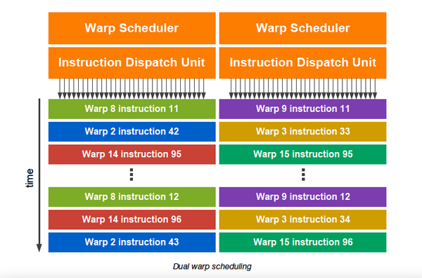 Весь пафос вычислений на GPU, будь то шейдеры или массированные неграфические расчеты, в следующем: программа порождает множество потоков инструкций (threads), и выполнение можно организовать таким образом, что в один момент времени большая часть потоков выполняет одну и ту же операцию, только с разными данными. Рабочая нагрузка для ядер CUDA внутри мультипроцессора поступает в виде пучков из 32 потоков (warp). В каждом ряду warp могут быть только одни и те же инструкции. Если это невозможно, то места в ряду пустуют.