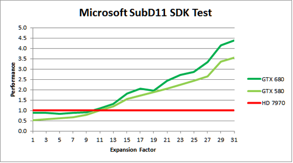 По данным внутреннего тестирования, GeForce GTX 680 заметно превосходит GTX 580 при высоком Expansion Factor (глубокая тесселяция). На том же графике приведен Radeon HD 7970, но его производительность почему-то совсем не колеблется, что вызывает большие сомнения в результатах.