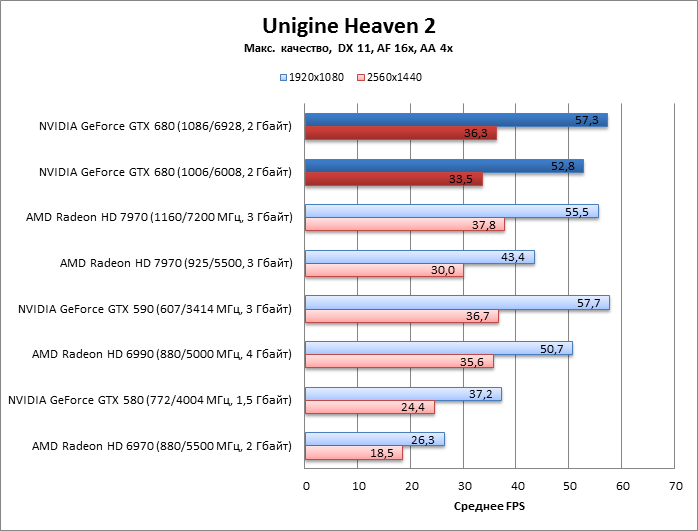 | Unigine Heaven 2 | DirectX 11 | Макс. качество, DirectX 11, тесселяция в режиме Extreme | AF 16x, MSAA 4x | 1920х1080 / 2560х1440 |