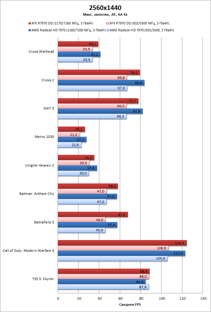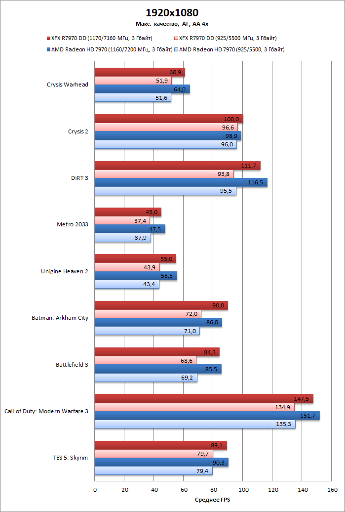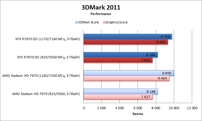 Без разгона XFX R7970 DD совершенно не отличается по производительности от референсного Radeon DH 7970. В разгоне XFX чуть-чуть медленнее за счет тех самых 10 МГц.