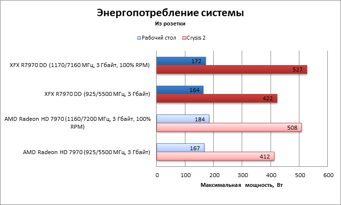 Так как GPU на XFX R7970 DD разогнался на 10 МГц меньше, чем на референсной карте, пиковое энергопотребление также меньше.