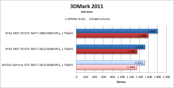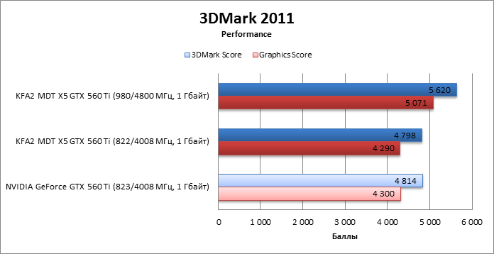 Так как MDT X5 работает на тех же частотах, что и референсный GeForce GTX 560 Ti, по очкам в 3DMark 2011 между ними нет никакой разницы. Разгон существенно увеличивает тестовые показатели.