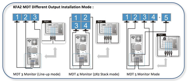 Собственно, зачем нужно такое изобилие видеовыходов и в чем особенность MDT X5? Дело в том, что NVIDIA позволяет создавать игровые мультимониторные конфигурации на картах референсного дизайна, но вплоть до серии GeForce 600 для этого требовались два GPU: либо два отдельных однопроцессорных адаптера, либо один «двухголовый» (аналогичная технология AMD Eyefinity в этом плане более демократична). Только GeForce GTX 680 справляется в одиночку. Во всех остальных случаях подключить два монитора одновременно можно, но объединить их в один рабочий стол для игры уже нельзя. KFA2 устраняет этот недостаток с помощью стороннего софта и дополнительной электроники на карте.