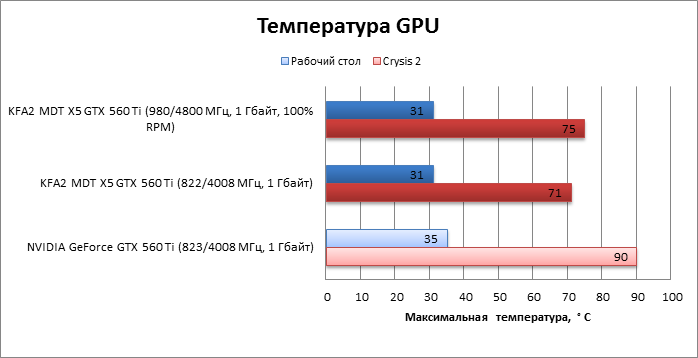 Несмотря на то, что кулер MDT X5 выглядел не столь мощным, как референсный, на практике он оказался гораздо эффективнее: разница температур под нагрузкой составила 19 °С. И даже если карту разогнать до предела, то с вентилятором на полных оборотах GPU под нагрузкой нагревается лишь на 4 градуса больше, чем в штатном режиме.