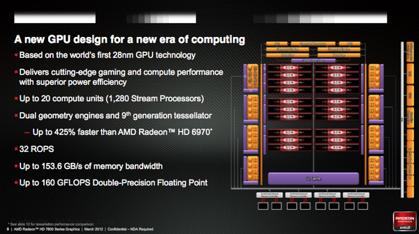В ядре Pitcairn есть 1280 «потоковых процессоров» и 80 текстурных блоков, но в чипах для HD 7850 активны только 1024 «процессора» и 64 текстурника. Число ROP (32 штуки) и разрядность шины памяти (256 бит) не урезаны. Таким образом, если Radeon HD 7870 по числу функциональных блоков эквивалентен двум HD 7770, то HD 7850 представляет собой половинку HD 7970. Объем памяти (2 Гбайт) и частота (4800 эффективных МГц) не изменились по сравнению с HD 7870, но GPU работает на существенно меньшей частоте: 860 МГц против 1 ГГц.