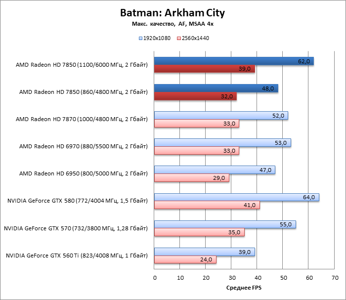 | Batman: Arkham City. Встроенный бенчмарк | DirectX 11 | Макс. качество | AF, MSAA 4x | 1920х1080 / 2560х1440 |