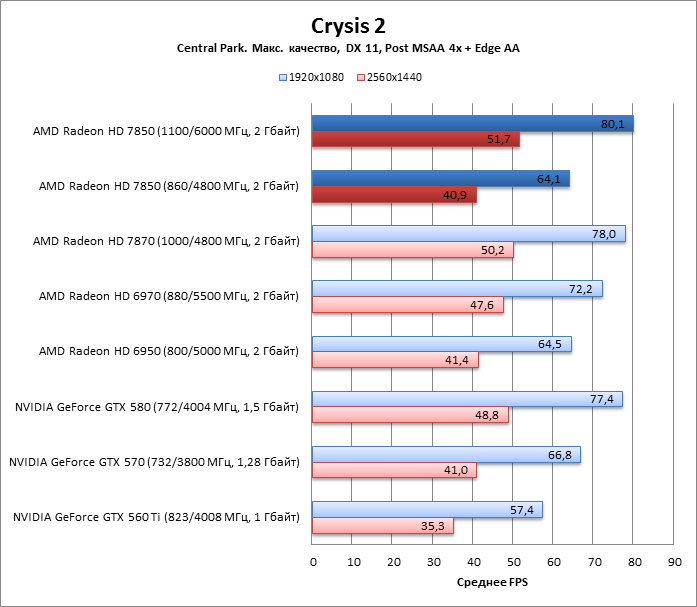 | Crysis 2 + Adrenaline Crysis 2 Benchmark Tool | DirectX 11 | Central Park. Макс. качество, DirectX 11, текстуры высокого разрешения | AF 16x, Post MSAA + Edge AA | 1920х1080 / 2560х1440 |