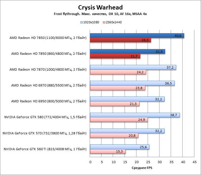 | Crysis Warhead + Framebuffer Crysis Warhead Benchmarking Tool | DirectX 10 | Frost flythrough. Макс. настройки, DirectX 10 | AF 16x, MSAA 4x | 1920х1080 / 2560х1440 |