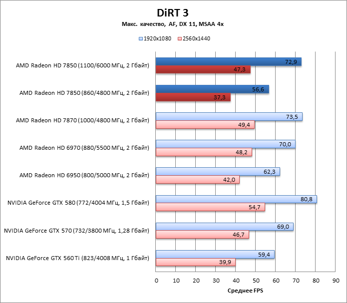 | DiRT 3 + Adrenaline Racing Benchmark Tool | DirectX 11 | Aspen, 8 машин. Макс. качество, DirectX 11 | AF, AA 4х | 1920х1080 / 2560х1440 |