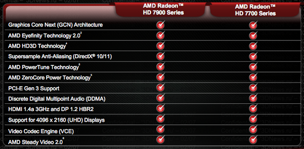 Все карты Radeon HD 7000 обладают полным набором функций GCN, за исключением полноценной поддержки вычислений с плавающей точкой двойной точности (FP64). Совместимость с этим форматом на уровне API есть в любом случае, но в HD 7850/7870 операции выполняются на скорости 1/16 от FP32 (Radeon HD 7950/7970 работают на скорости 1/4).