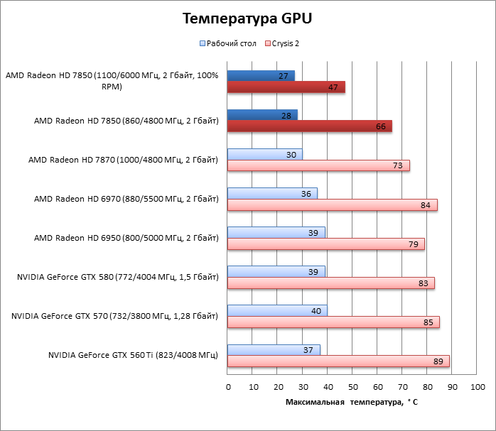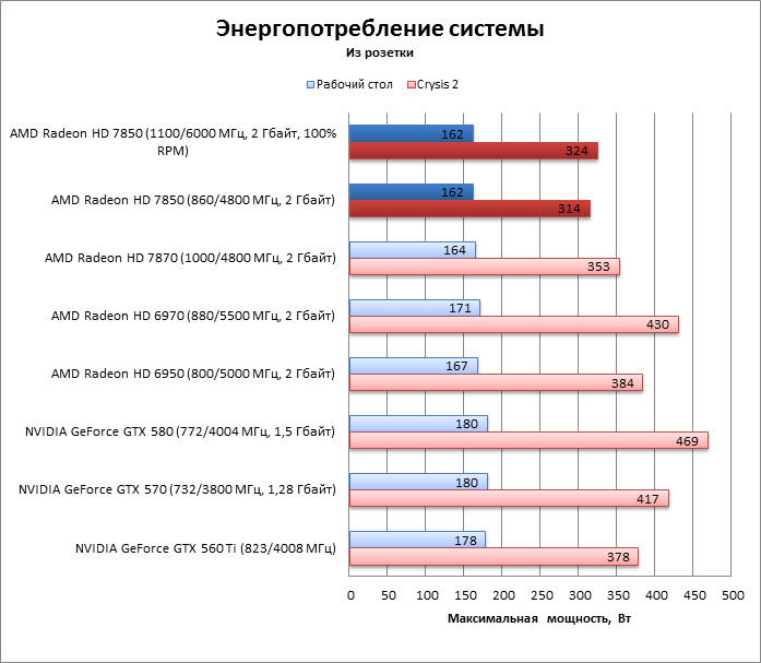 Тепловыделение карты не превышает 130 Вт. Это на 45 Вт меньше, чем у HD 7870 (175 Вт), и на 70 Вт меньше, чем у Radeon HD 6970 (200 Вт), аналогом которого по производительности может стать HD 7850. Близкие по производительности карты NVIDIA 500-й серии также потребляют немало: GeForce GTX 560 Ti — 170 Вт, а GTX 570 — 219 Вт.