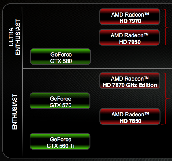 Radeon HD 7850 закрывает парад видеокарт на платформе AMD, который мы внимательно сопровождали этой зимой и весной. И судя по всему, у HD 7850 есть шансы стать одной из самых популярных моделей в серии. Она находится в выгодной позиции на нижней границе категории High-End. Такие карты обычно стоят заметно меньше, чем полноценный High-End для энтузиастов, а производительность дают такую, что покупатель не чувствует себя обделенным и может играть во все современные игры с максимальными настройками. Судя по слайду AMD, именно так и должно быть. Если Radeon HD 7870 по производительности находится между GeForce GTX 570 и GTX 580, то HD 7850 стоит лишь немного ниже GTX 570. А GTX 570 в сочетании с хорошим CPU пока что вполне достаточно для любой игры.