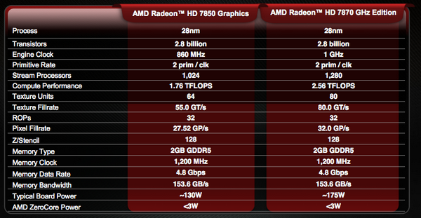 HD 7850 и HD 7870 основаны на GPU под названием Pitcairn c архитектурой Graphics Core Next (GCN). GCN обеспечивает большой прирост производительности по сравнению с картами серии Radeon HD 6000 и поддержку ряда новых технологий: PCI-E 3.0, DirectX 11.1, интерфейсов DisplayPort и HDMI с разрешением 3840x2160, эффективных механизмов энергосбережения и так далее. Подробно архитектура GCN описана в обзоре Radeon HD 7970.