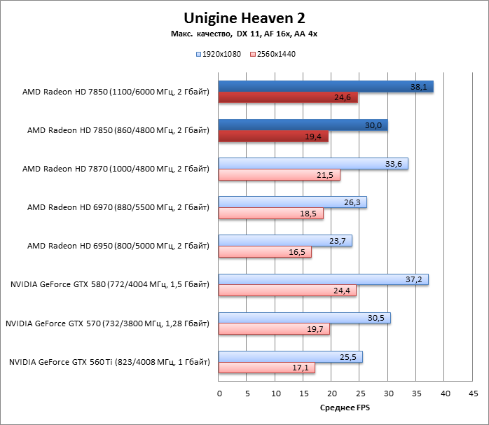 Особо отметим отменный разгонный потенциал HD 7850. Все карты линейки Radeon HD 7000 отлично разгоняются, но для HD 7850 разгон, пожалуй, дает наибольший практический эффект. Частота GPU изначально занижена до 860 МГц, и подъем даже до 1100 МГц значительно увеличивает производительность. Разогнанный HD 7850 соревнуется не только с HD 7870, но и с GeForce GTX 580, при этом сохраняя преимущество в энергопотреблении.