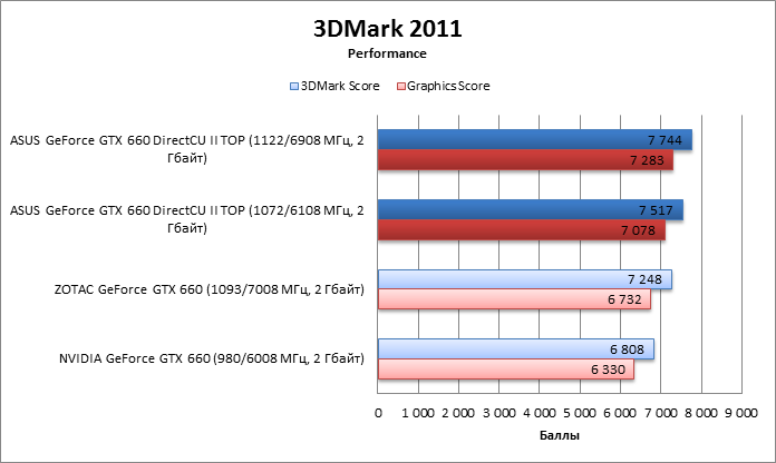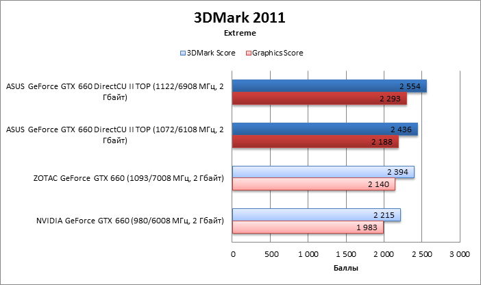 3DMark показывает, что карта с референсной PCB даже при максимальном разгоне не достигает уровня ASUS GTX 660 DirectCU II TOP, работающей на штатных частотах. Разгон самой карты ASUS дает еще один заметный скачок баллов.