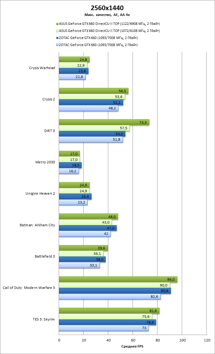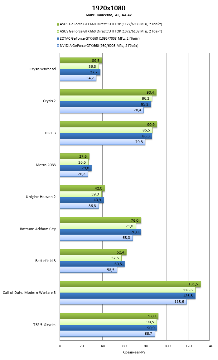 Эффект от заводского разгона ASUS GTX 660 DirectCU II TOP меняется от игры к игре. Заметный прирост фреймрейта по сравнению с референсными частотами наблюдается в Crysis 2, DiRT 3 и Call of Duty: Modern Warfare 3. Но нельзя не отметить, что в абсолютных показателях разница укладывается в 8 FPS в разрешении 1920х1080. Другие игры на повышенные частоты отреагировали вяло.