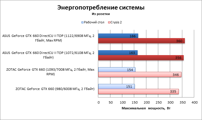 По энергопотреблению ASUS GTX 660 DirectCU II TOP в нашем бенчмарке оказался на 21 Вт прожорливей карты на референсной PCB. А вот дополнительный разгон лишь незначительно увеличил этот результат.