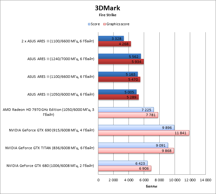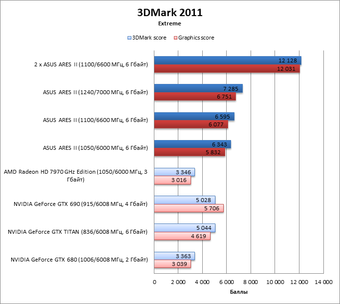 Стенд с GeForce GTX 690 по уровню Graphics score уступает ARES II, даже если последний работает на частотах референсного HD 7970 GHz Edition.