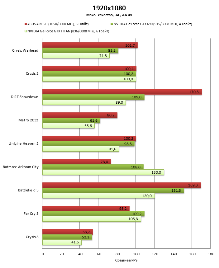 GeForce GTX 690 также в лучшем случае лишь на треть быстрее GTX 680, но выглядит привлекательно на фоне ARES II.