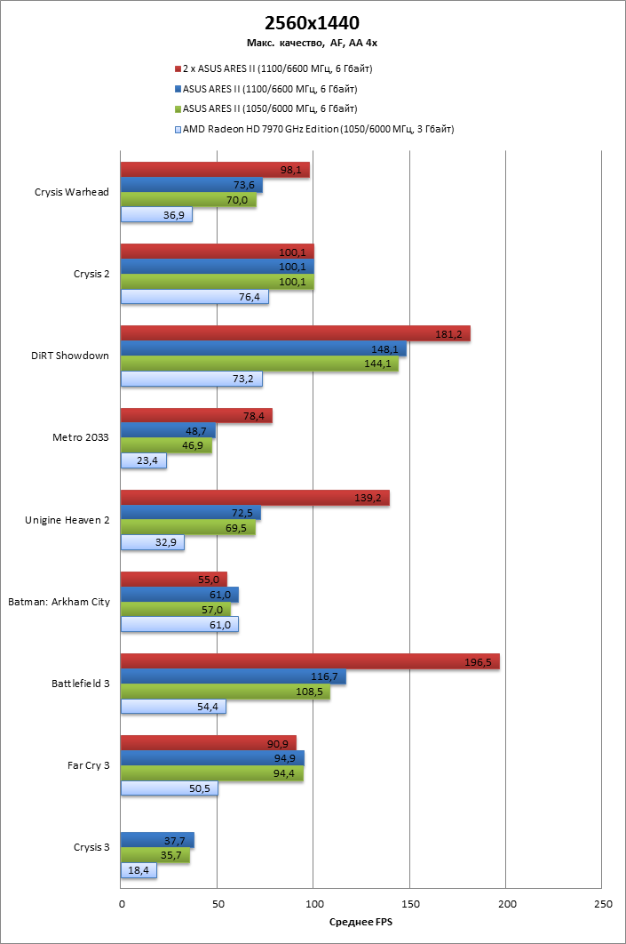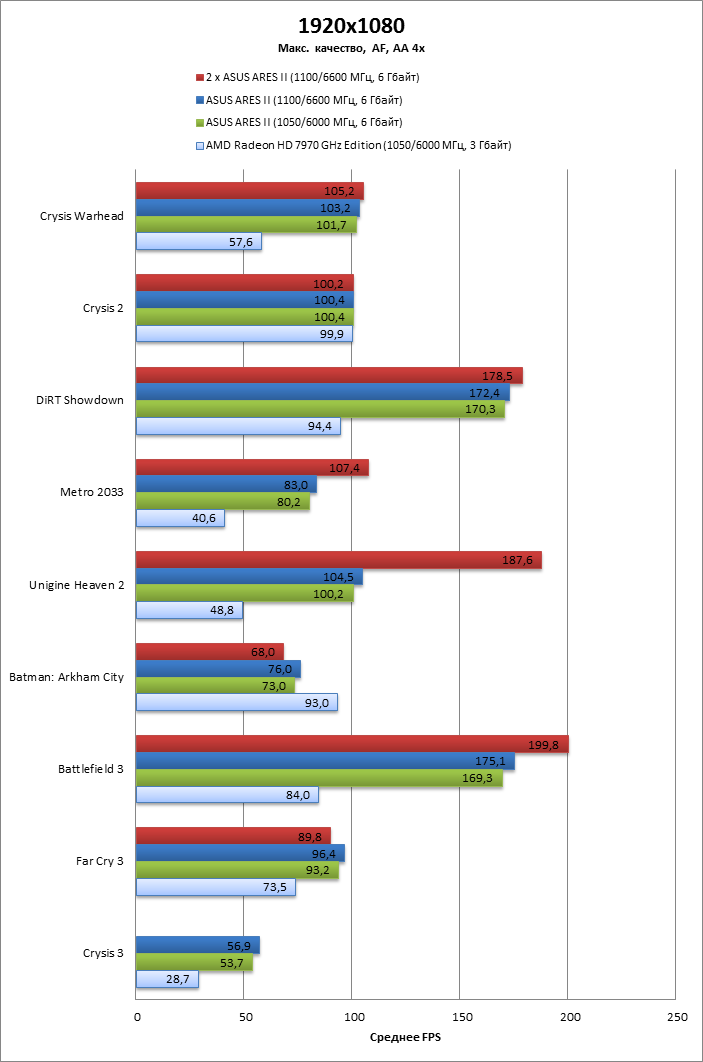Переход от HD 7970 GHz Edition к ARES II на тех же частотах обеспечивает строго двукратное увеличение фреймрейта.
